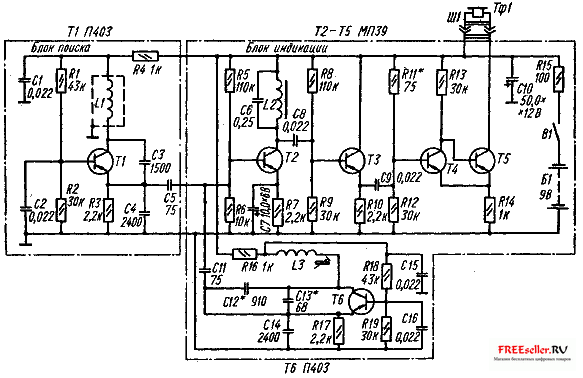 Измерительный генератор собран на транзисторе Т1, частота которого 510 кГц. Колебательный контур генератора состоит из катушки L1 и конденсаторов СЗ, С4. Опорный генератор выполнен на транзисторе Т6, его колебательный контур состоит из катушки L3 и конденсаторов С12-С14. Смеситель собран на транзисторе Т2, в его нагрузке (контур L2, С6) выделяются колебания разностной частоты. Эмиттерный повторитель (ТЗ) служит для согласования смесителя с триггером на транзисторах Т4, Т5. Триггер срабатывает при напряжении 0,5 В. Поисковая катушка L1 выполнена в виде кольца диаметром 300 мм. Витки катушки заключены в дюралюминиевый электростатический экран диаметром 8 мм. Для изготовления катушки берут 10 отрезков провода ПЭВ-2 диаметром 0,96 мм, длиной 1250 мм. Этот жгут пропускают сначала в поливинилхлоридную трубку длиной 1000 мм, а затем в дюралюминиевую трубку длиной 960 мм и изгибают в виде кольца. Концы проводов соединяют между собой последовательно. Экран не должен образовывать короткозамкнутого витка. Катушка смесителя (L2) намотана на кольцевом сердечнике из феррита марки М2000НМА типоразмера К38 X 24 X 7 мм. Катушка имеет 200 витков провода ПЭВ-2 диаметром 0,47 мм. Катушка L3 содержит 135 витков провода ПЭЛШО диаметром 0,1 мм. В ней необходимо предусмотреть подстроечный латунный сердечник.
