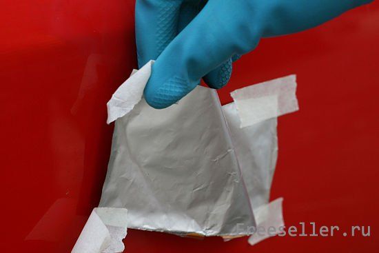 На вмятину прикрепляем лист алюминиевой фольги.