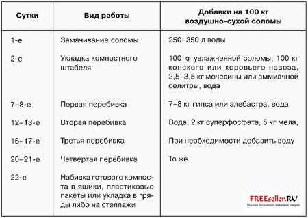 Солома должна быть чистой, без следов плесневения, с участков, не обработанных пестицидами. Подготовка компоста состоит из нескольких этапов. Сначала замачивают солому на сутки в каком-либо резервуаре или просто обильно поливают ее водой из шланга или из ведра. Затем солому и навоз укладывают в штабель слоями, так, чтобы в нем было не менее 3-4 слоев навоза и 3-4 слоев соломы. Каждый слой соломы дополнительно слегка увлажняют и посыпают мочевиной или аммиачной селитрой, приблизительно по 600 г на слой, чтобы на все 100 кг соломы пришлось 2,5 кг удобрения.