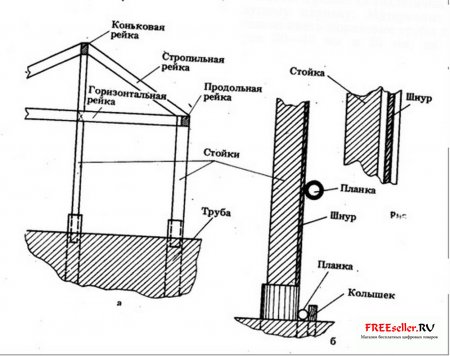 По углам площадки и периметру с ом 0,8 м вбивают в землю отрезки 1,5-дюймовых водопроводных труб длиной 35-40 см (рис. 1, а). Забивают их так, чтобы над поверхностью земли оставался отрезок высотой около 5 см. В эти трубы вставляют стойки из деревянных брусков. Все бруски спиливают с внешней стороны на четверть и к ним крепят боковые продольные рейки. При стыковке боковых продольных реек стык должен находиться на одной из стоек.