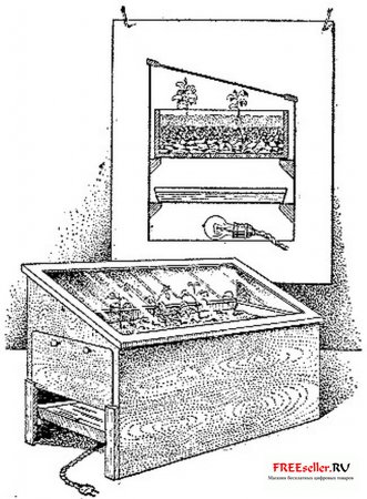 Для обогревания этого ящика кладут на дно перегорающий навоз или, что особенно принято в комнатах, сооружают специальное приспособление. Из фанеры делают футляр без дна и верха. На планки внутри ставят оцинкованный противень, в который наливают воду; выше, на другие планки, ставят парниковый ящик, а сверху весь футляр закрывают рамой со стеклом.