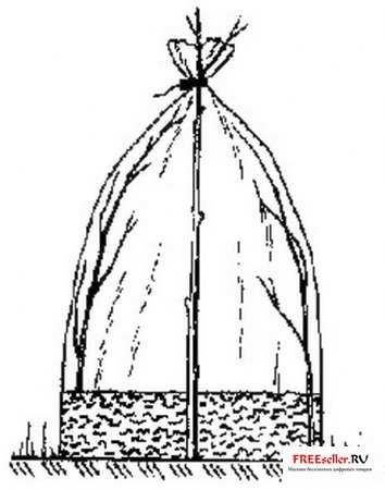 Отрезаем кусок полиэтиленового "рукава" длиной примерно 1,5 м, расправляем его и одеваем на "забор" как чулок, натягивая до земли. Нижнюю часть «рукава», натянутую на прутья, расправляем от морщин, верхнюю часть расправляем. Снаружи укрытия по тому же кругу вбиваем между прутиками колышки высотой 50 см, чтобы в дальнейшем пленку не распирало землей.