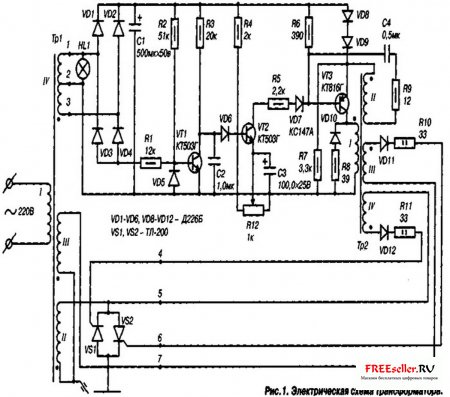 Принципиальная электрическая схема трансформатора приведена на рис. 1. Как следует из схемы, данное устройство - это разновидность трансформатора с тиристорным управлением, получившего распространение в последнее время. Для изготовления трансформатора и регулятора тока используют доступные материалы и детали.