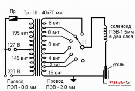 С отводов вторичной обмотки трансформатора Тр1 переключателем П1 подаётся требуемое напряжение сварки (в пределах 10-36 В). Включается трансформатор в сеть 127 в или 220 в перестановкой вилки питания в соответствующие гнёзда.