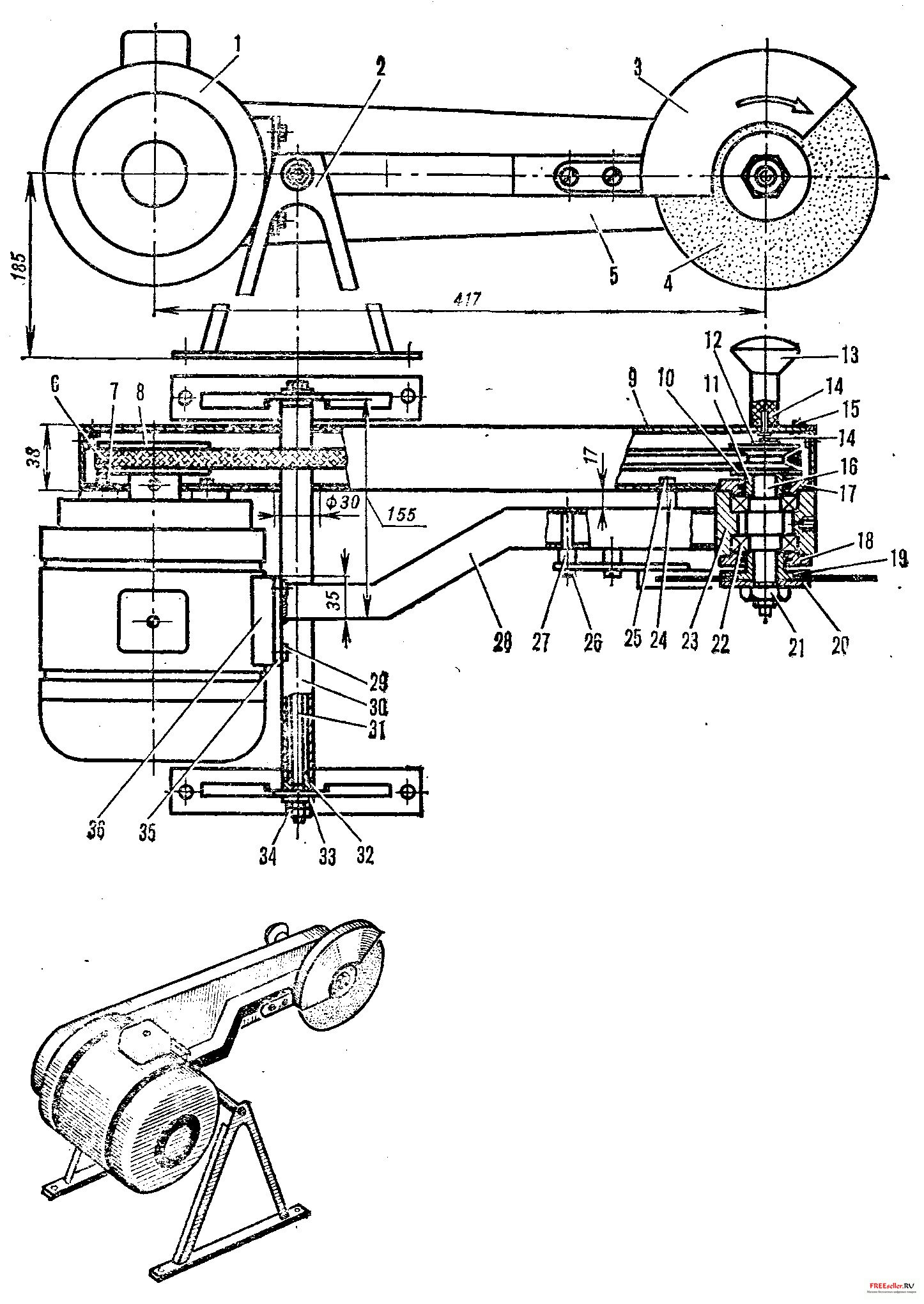 Кожух ремня и кожух абразивного диска - из листовой стали толщиной 2 мм. Сваривать заготовки лучше всего изнутри угловым швом. Кожух ремня крепится винтами непосредственно к двигателю и раме, к которой привинчен и кожух абразивного диска. Приводная рукоятка располагается на съемной крышке кожуха ремня.