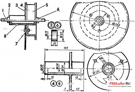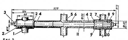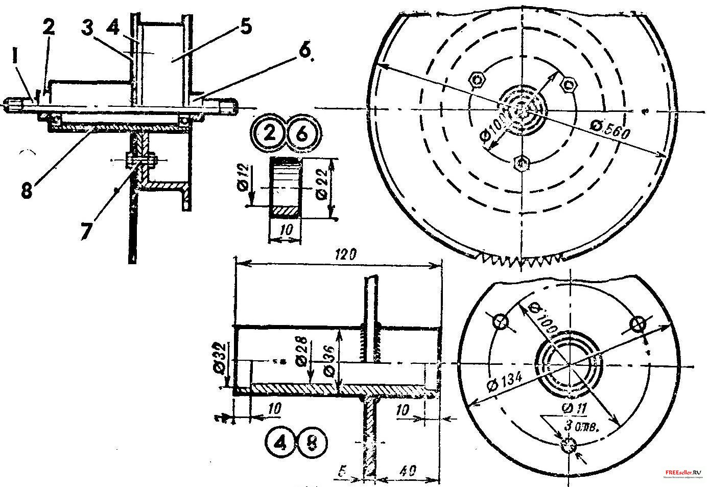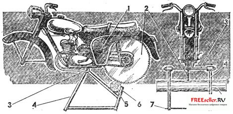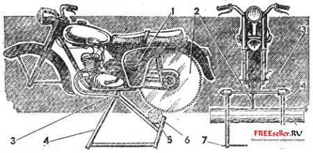 Последовательность переоборудования мотоцикла такова. Сначала снимается резиновая подушка подножки, выбиваются штифты и удаляется труба подножки, а на ее место устанавливается ось качания и надеваются распорные втулки. Затем мотоцикл приподнимается, надеваются велосипедные рамы основания и скрепляются стяжкой. Смотровой люк правой крышки картера снимается, и вместо болта крепления генератора ввинчивается шпилька фиксации цилиндра. После этого монтируются левая крышка вентилятора, втулка, сам вентилятор и правая крышка с направляющим кожухом. (Головку двигателя для лучшего обдува можно повернуть на 90°.) Наконец, с мотоцикла снимаются колеса, а место заднего занимает циркулярная пила.