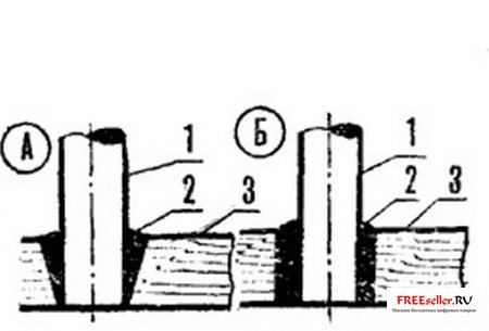 Следующая операция - установка направляющих трубок. Они должны быть строго вертикальны: несоблюдение этого требования может свести на нет затраченные усилия, поэтому рекомендую придерживаться следующей очередности работ. Сначала в основании просверлите отверстие под одну из трубок любым имеющимся сверлом и ножом придайте ему коническую форму, как показано на рисунке 2а. Затем вставьте трубку (последняя должна входить в нижнюю часть отверстия с натягом) и с помощью угольника установите ее вертикально. После этого кольцевой зазор между направляющей и поверхностью конического отверстия залейте эпоксидным клеем. Диаметр второго гнезда должен быть на 2-3 мм больше, чем трубка (см. рисунок 2б). Наденьте на первую направляющую уголки ползуна и, используя последние как кондуктор, вставьте в гнездо основания вторую направляющую трубку. Зазор также залейте клеем и всю конструкцию оставьте в таком положении до полного отверждения эпоксидки.