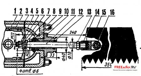В качестве приводного механизма пилы используется с небольшими усовершенствованиями пусковой двигатель трактора ПД-10. Прежде всего необходимо заменить стандартный шкив на больший - ? 260 мм. Лучше использовать от списанного тракторного двигателя Д-37. Он будет работать как маховик, поскольку у него есть противовес, компенсирующий поступательное движение пилы. Отверстие под свечу следует увеличить до 30 мм и вставить в него втулку с сальником, фиксирующимся в головке цилиндра гайкой М30. Поршень двигателя тоже подвергают доработке: строго по центру высверливается отверстие ? 12 мм и вокруг него четыре отверстия ? 6 мм для того, чтобы избавиться от компрессии. Рядом с центральным отверстием высверливают углубление ? 4 мм для фиксатора стопорной шайбы, которая надевается на шток. Последний представляет собой стальной пруток длиной 240 мм и ? 16 мм. Один конец его имеет резьбу М16, а другой - М12 и лыску для стопорной шайбы. В цилиндре шток фиксируется гайкой М12. На противоположный конец навинчивается держатель пилы и закрепляется контргайкой в требуемом положении. В качестве пилы можно использовать обычную ручную ножовку, обрезанную до 350 мм. Самое главное, чтобы при установке рабочего органа его режущая кромка была строго параллельна ходу штока. Исходя из этого, следует делать вырез под держатель.