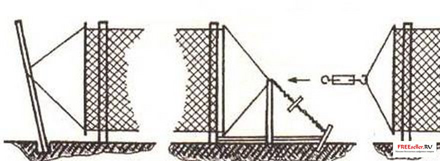 Выполняется оно так. Сквозь крайние ячейки пропускается стальной стержень. К нему привязывается трос, и с его помощью натягивают сетку. На рис. 4 приведены несколько приспособлений для этой операции. Проще всего использовать рычаг - длинную крепкую жердь, один конец которой, чтобы не скользил, опущен в ямку, а другой тянут веревками. Можно применить резьбовую натяжную муфту или лучок, закрутив крепкую двойную веревку или трос. Но при этом надо иметь опору, за что можно было бы зацепить лучок или муфту: дерево, столб или стену здания. А самое простое - вкопать в землю бревно.