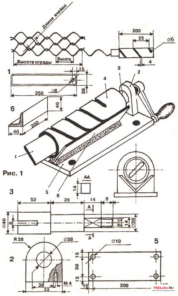 Рис. 1 Станок для плетения сетки рабица: 1 - нож; 2 - опора; 3- вал; 4 - труба; 5 - основание; 6 - уголок.