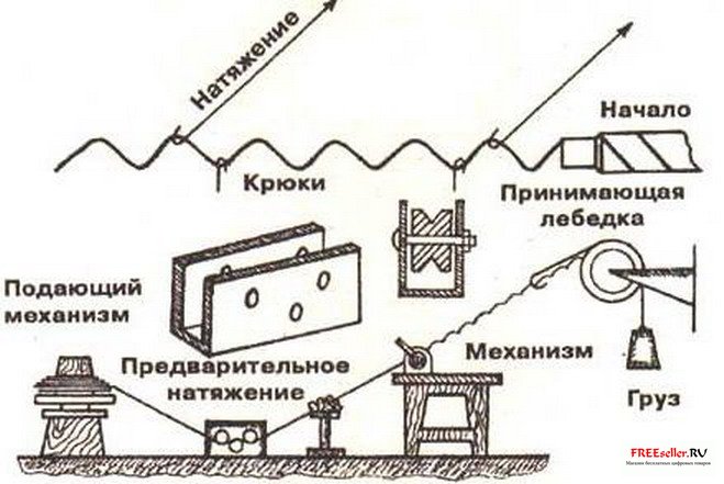 Рабочий стол располагают так, чтобы натянутая под углом проволока поступала наверх на принимающий барабан. Это может быть стойка, к которой прикреплен деревянный вал или жердь (рис. 2).