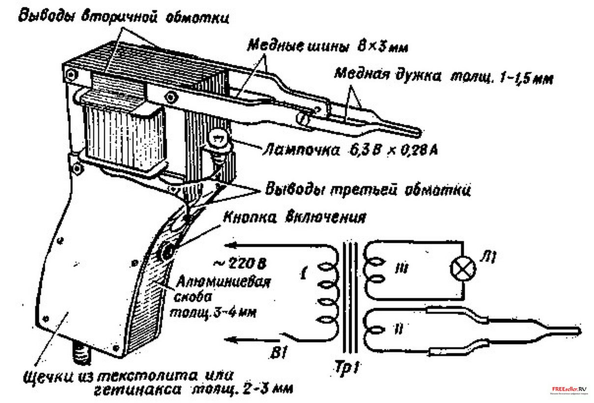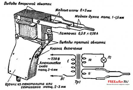 Основной частью паяльника является понижающий трансформатор. Во вторичной его обмотке ток силой в несколько десятков ампер, который и нагревает медную дужку - рабочую часть паяльника. Для освещения места пайки предусмотрена осветительная лампочка (6,3 В, 0,28 А). Включение паяльника осуществляется кнопкой, расположенной на ручке.