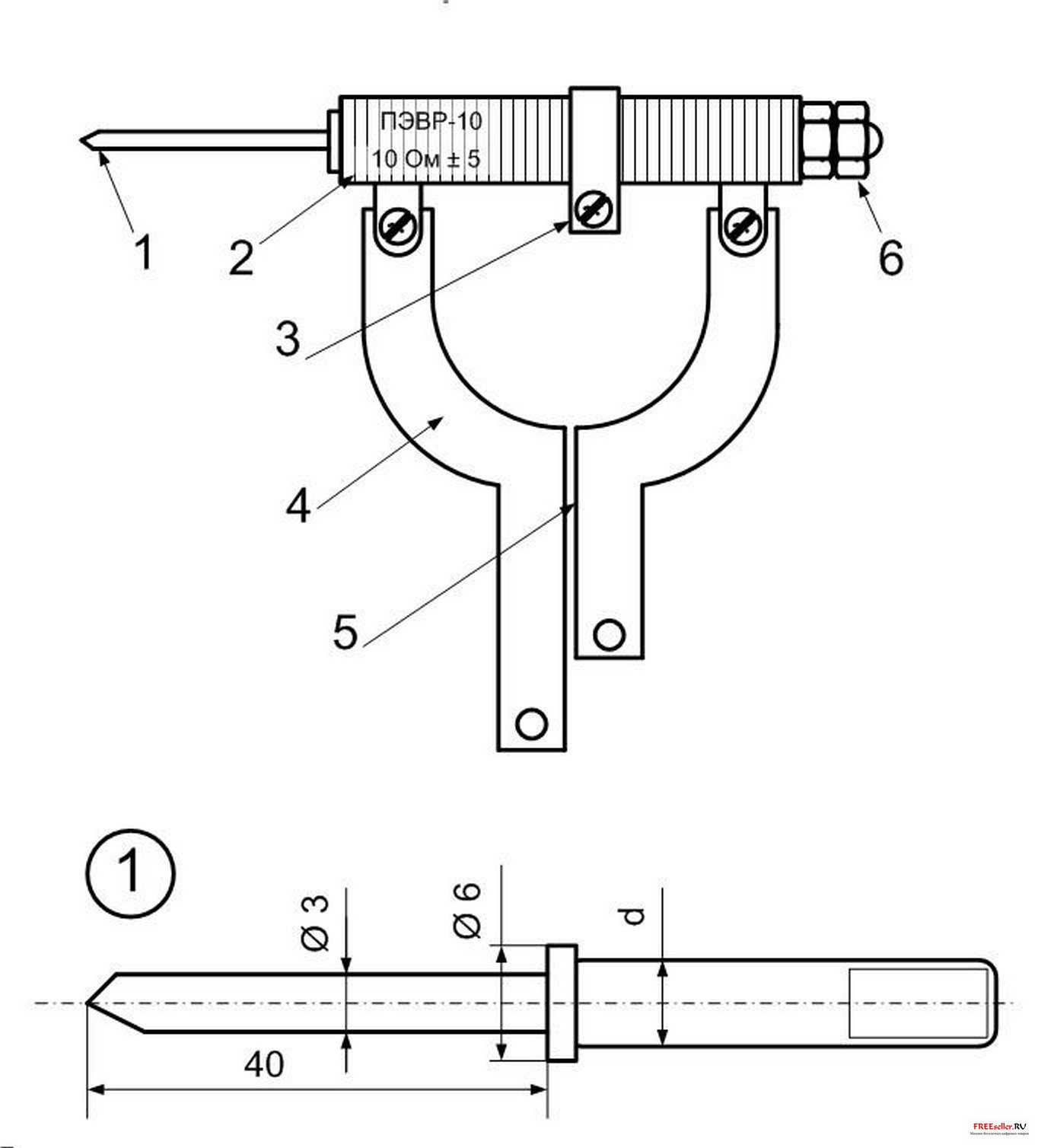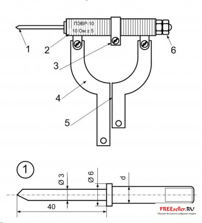 В проволочный резистор ПЭВР-10 сопротивлением 10 Ом ± 5 (его можно купить в магазине радиодеталей) вставлено дообработанное жало от старого паяльника. Из фольгированного гетинакса толщиной 3 мм изготовлен держатель 4. Один провод питания присоединен к ножке держателя, другой - к бегунку 3. Для удобства пользования паяльником держатель вставлен в ручку от старой переносной лампы.
