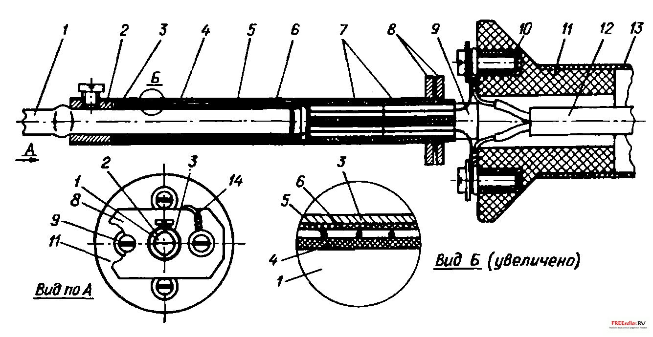Рис. 1 Миниатюрный низковольтный паяльник: 1 - стержень, 2 - втулка со стопорным винтом, 3 - кожух паяльника, 4 - керамическая трубка, 5 - проволочный нагревательный элемент, 6 - слюдяная трубка, 7 - керамические трубки малого диаметра, 8 - фланцы, 9 - втулка стойка, 10 - резьбовая втулка, 11 - передняя пробка ручки, 12 - кабель питания паяльника , 13 - трубчатый корпус паяльника, 14 - провод заземления.