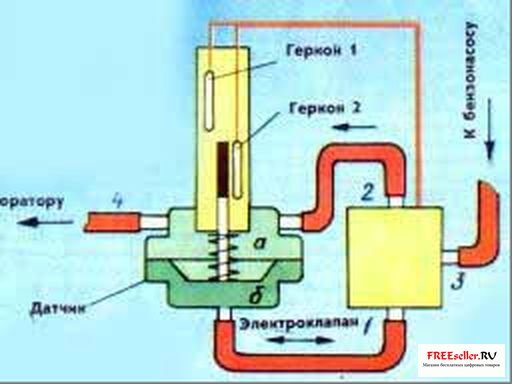 В верхнее положение диафрагма переходит под действием давления горючего, поступающего от бензонасоса, а в нижнее ее возвращает пружина 6. Для включения датчика в топливную магистраль предусмотрены три штуцера 1 (один на поддоне и два - на корпусе). Гидравлическая схема расходомера показана на рис. 2. Через канал 3 и электроклапан топливо от бензонасоса поступает в каналы 1, 2 и заполняет верхнюю и нижнюю полости датчика, а через канал 4 поступает в карбюратор. Переключается клапан под действием сигналов электронного блока (на этой схеме не показан), управляемого герконовым коммутатором датчика.