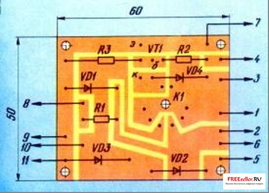 В расходомере предусмотрена возможность его отключения тумблером SA1. В этом случае диафрагма датчика постоянно находится в нижнем положении и топливо по каналам 2 и 3 через полость а будет напрямую поступать в карбюратор. Для реализации возможности отключения устройства в электроклапане необходимо снять резиновую манжету, перекрывающую канал 3, но при этом ухудшится погрешность расходомера. Электронный блок смонтирован на печатной плате из стеклотекстолита толщиной 1,5 мм. Чертеж платы показан на рис. 4. Детали, устанавливаемые на плату, обведены на схеме штрихпунктирной линией. Плата смонтирована в металлической коробке и укреплена в салоне автомобиля под щитком приборов.
