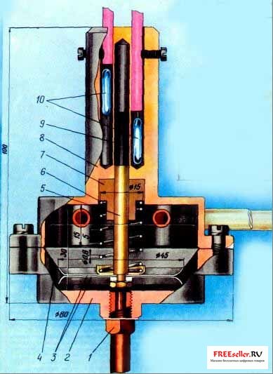 Puc.1. 1-Штуцер, 2 - Поддон, 3- Шайбы, 4 - Диафрагма, 5- Шток, 6 - Пружина, 7 - Втулка, 8 - Корпус, 9 - Магнит, 10 - Герконы