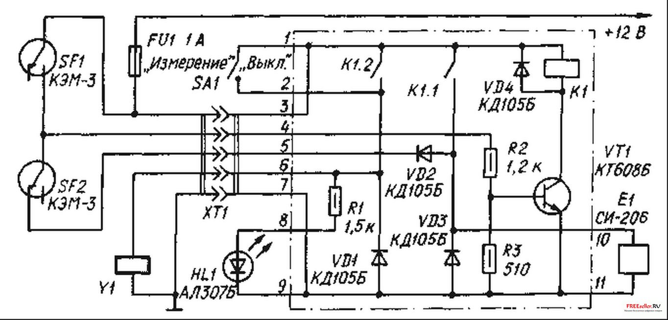 В исходном состоянии обмотка электроклапана обесточена, канал 3 сообщается с каналом 1, а канал 2 пепекрыт. Диафрагма находится в нижнем положении, как показано на схеме. Бензонасос создает избыток давления жидкости в нижней полости 6. По мере выработки двигателем топлива из верхней полости а датчика диафрагма будет медленно подниматься, сжимая пружину. При достижении верхнего положения сработает геркон 1 и электроклапан закроет канал 3 и откроет канал 2 (канал 1 открыт постоянно). Под действием сжатой пружины диафрагма быстро переместится вниз, в исходное положение, и перепустит топливо через каналы 1, 2 из полости б в а. Далее цикл работы расходомера повторяется. Электронный блок (Puc.3) подключают к датчику и электроклапану гибким кабелем через разъем ХТ1. Горкомы SF1 и SF2 (1 и 2 соответственно, по рис. 2) установлены в датчике (на схеме они изображены в положении, когда магнит не воздействует ни на один из них); Y1 - обмотка электромагнита клапана. В исходном положении транзистор VT1 закрыт, контакты К1.2 реле К1 разомкнуты и обмотка Y1 обесточена. Магнит датчика находится рядом с герконом SF2, поэтому геркон тока не проводит.