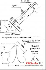 Это простое приспособление ускоряет окучивание картофеля и его междурядную обработку. Оно состоит из двух лемехов-отвалов, к которым прикреплено дышло (рукоятка-черенок). Оба отвала выполнены за одно целое из листовой стали толщиной 1,5-2 мм.