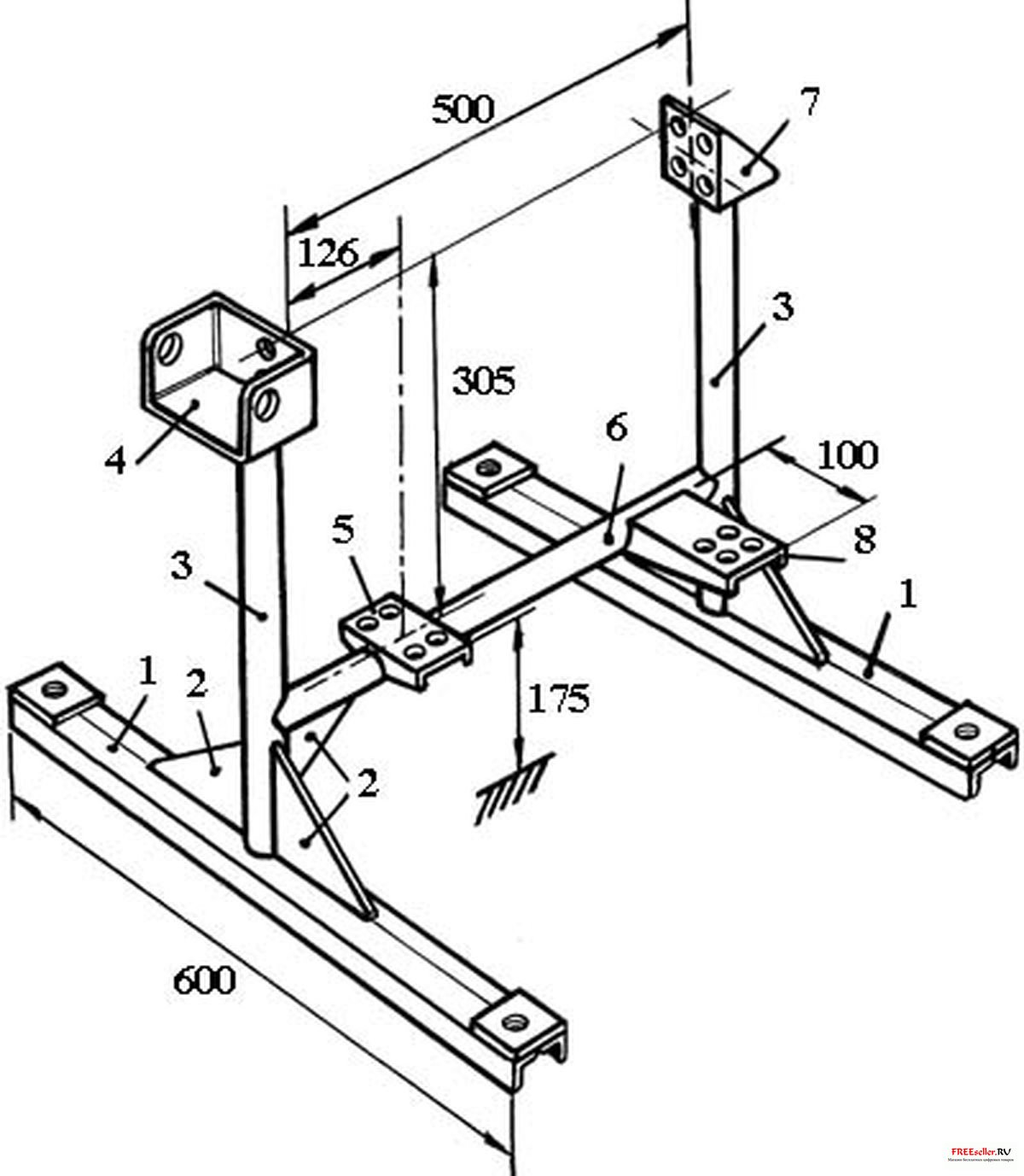 Станина агрегата (рис. 2) трубчатая Н-образная, приваренная к двум горизонтальным опорам. Стальные трубы диаметром 30...35 мм нарежьте ножовкой по металлу и сварите с горизонтальными опорами газовой или электросваркой. Затем из листовой стали толщиной 2,5...3 мм изготовьте шесть штук "косынок" жесткости и площадку для крепления нижнего фланца рамы УМУ. Эти детали приварите к станине. Далее закрепите четырьмя болтами М8 раму УМУ к площадке.