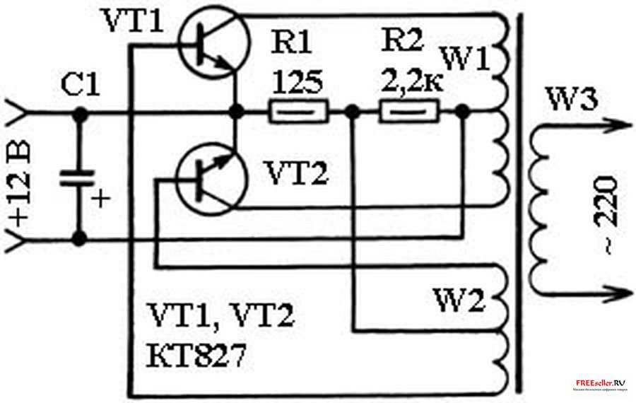 Он представляет собой двухтактный генератор (мультивибратор) с трансформаторной связью. Собран он на двух транзисторах, включенных по схеме с общим эмиттером и трансформатором. Напряжение, снимаемое с делителя напряжения R1 и R2, задает смещение на базах обоих транзисторов.