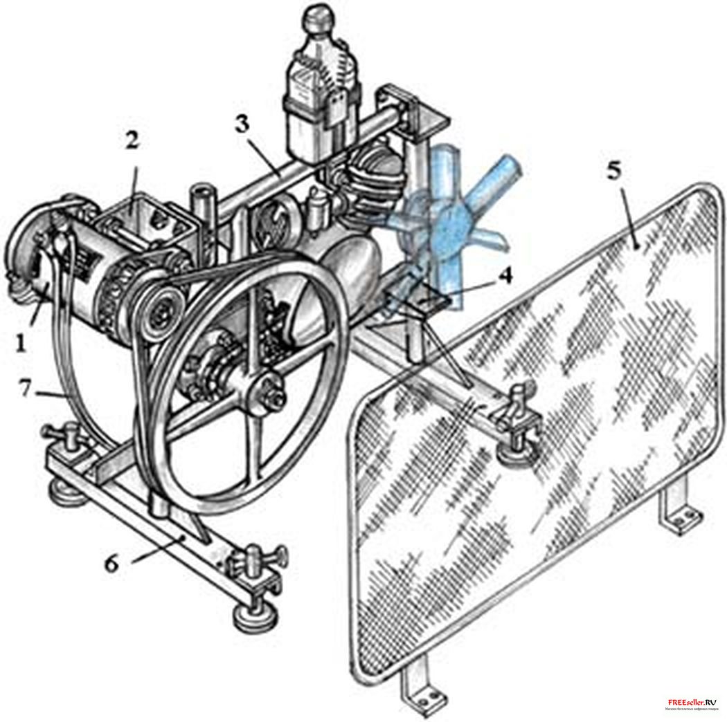1 - генератор; 2 - кронштейн крепления генератора; 3 - рама УМУ; 4 - площадка крепления вентилятора; 5 - оградительная сетка; 6 - станина; 7 - кабель генератора 12