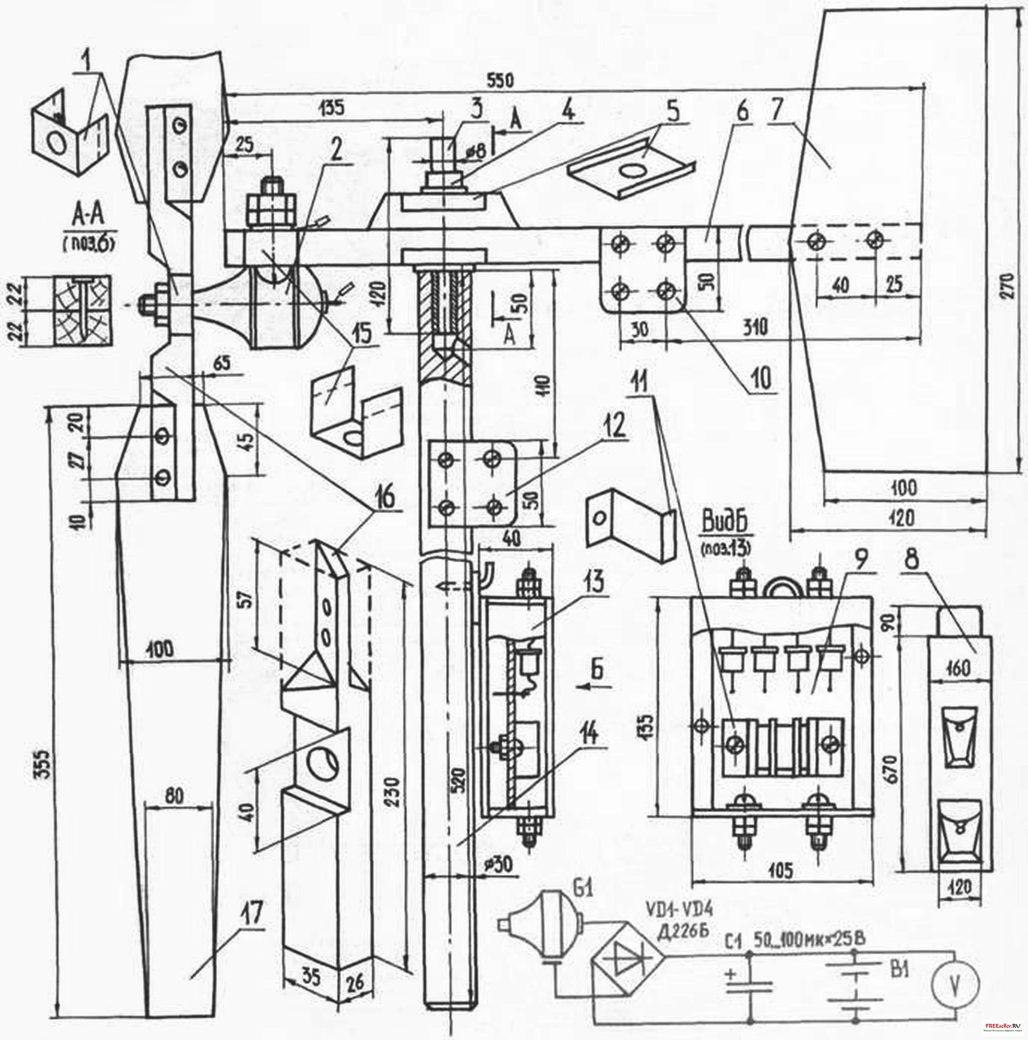 Генератор ПВЭС работает на зарядку аккумуляторной батареи. Переменный ток, вырабатываемый «динамкой», выпрямляется с помощью моста из четырех диодов с током не менее 100 мА. Выпрямленный ток поступает на зарядку трех аккумуляторных элементов типа Д-0,26, которые собираются в батарею и вставляются между зажимами 13, изготовленными из латуни или жести. Параллельно выпрямителю надо подсоединить электролитический конденсатор емкостью 50-100 мкФ. Он сгладит пульсацию. Для измерения напряжения следует приобрести вольтметр на 10 В.