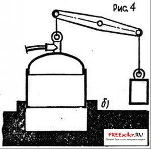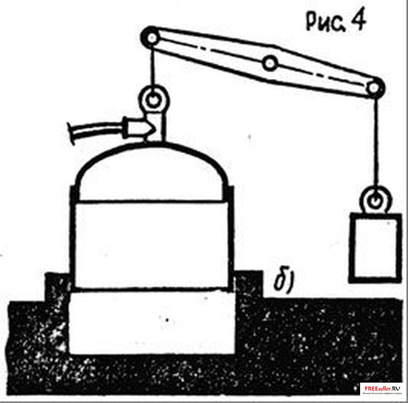 На рисунке мы показываем схему уравновешивания колокола с двумя блоками (рис. 4а) и противовесом и вариант «журавль» (рис. 46). Погрешность, получающаяся за счет нестрого вертикального перемещения точки подвески колокола на "журавле» (по дуге окружности), пренебрежимо в связи со значительным превышением плеча рычага над ходом коромысла.