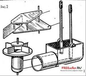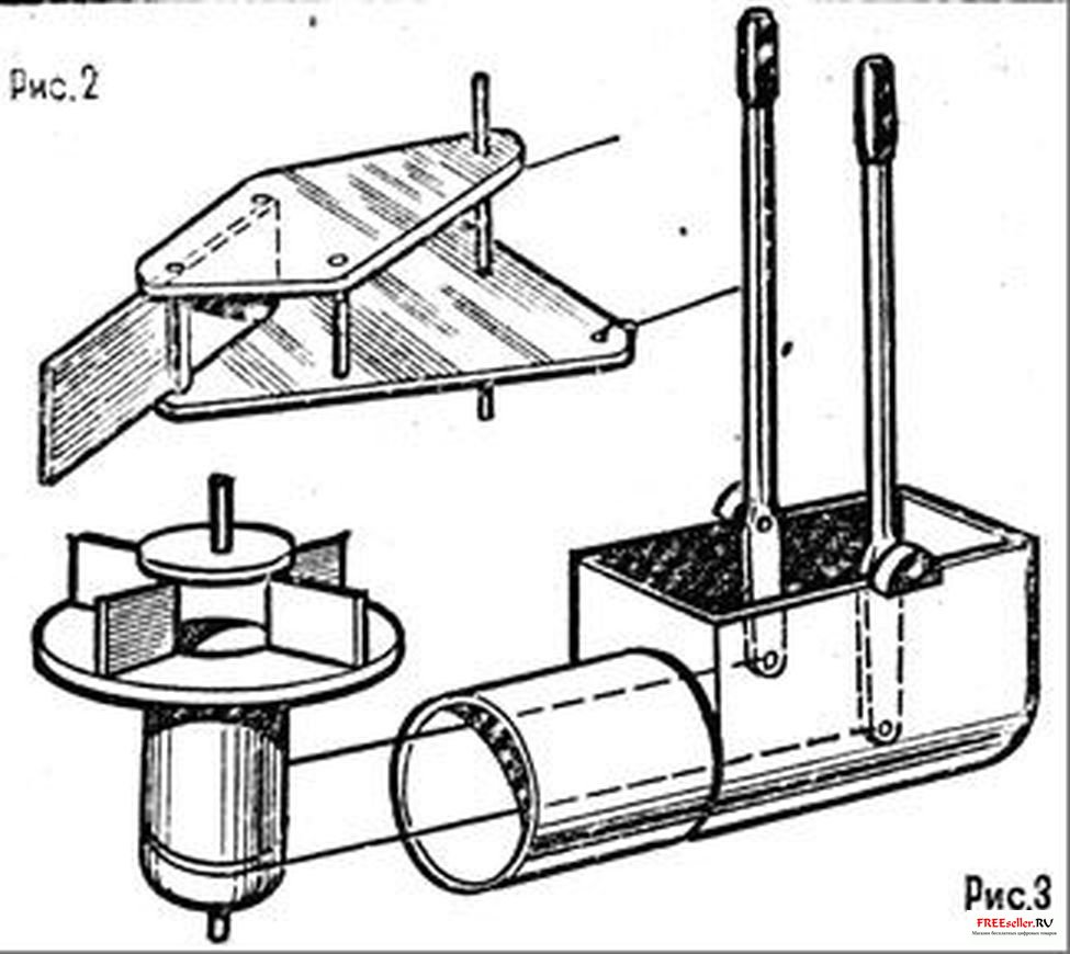 Простейшую мешалку несложно изготовить в виде крыльчатки с приводом гибкими связями через тот же сифонный трубопровод (рис. 3).