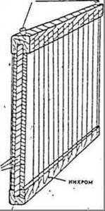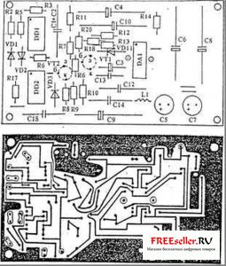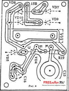 Прибор выполнен в корпусе размером 24x20x8. см. Органы управления и органы контроля выведены на переднюю панель, выходные клеммы и предохранители - на заднюю. Печатные платы самого прибора и стабилизатора выполнены из одностороннего фольгированного стеклотекстолита толщиной 1,5 мм и показаны соответственно на рис.3 и 4. Общий вид прибора показан на рис-5. Рамка сбора яда представляет собой пластину из стекла размером 400x260 мм, толщиной 3 мм. На длинных сторонах пластины установлены деревянные планки с пазом, в который вставляется стекло. Поверх деревянных пластин намотано по 50 витков провода "нихром" толщиной 0,2...0,3 мм с обеих сторон, так чтобы витки одной катушки были расположены между витками другой. Расстояние между соседними витками равно 4 мм. Противоположные витки катушек подключены к клеммам и на них подается выходное напряжение прибора. Вторые концы катушек свободны. Сопротивление одной катушки равно 300 Ом. Под витки вставляются две стеклянные пластины (с обеих сторон), на которых кристаллизуется оставленный пчелами яд. Конструкция рамки показана на рис.6. Необходимо отметить, что данный прибор требует осторожного обращения, так как может "ужалить" так же больно, как и настоящая пчела.