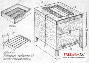 Каждый ряд отверстий прикрывается фанерной планочкой, передвигающейся в пазах брусочков, прибитых к крышке. На этих планочках также делают отверстия диаметром 2,5 см. Передвигая планочку, мы можем частично или полностью открывать или закрывать отверстия-вентиляторы.