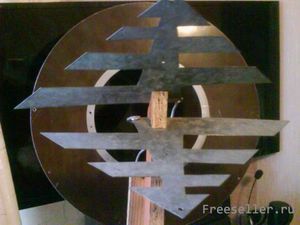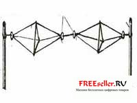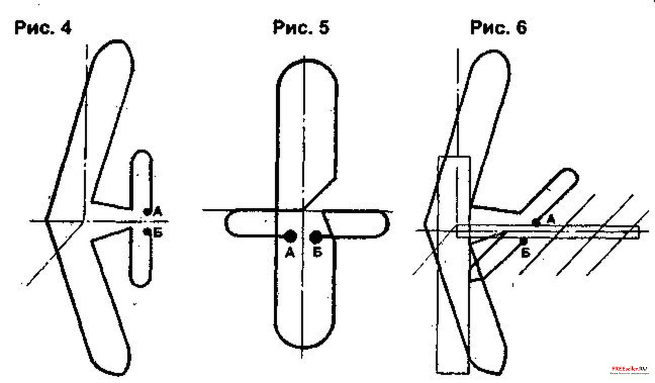 У нас в городе вещание на метровом диапазоне ведется с вертикальной, а на дециметровом - с горизонтальной поляризацией волн. Антенна состоит из двух вибраторов. Вибратор метрового диапазона согнут под углом 120°. Перед ним расположен вибратор дециметрового диапазона (рис.1). Развертка полотна антенны по казана на рис.2. Вибраторы сгибаются под углом 90° друг к другу. Вид антенны спереди показан на рис.3, общий вид - на рис.4. Антенна вертикальной поляризации метрового и горизонтальной дециметрового диапазонов показана на рис.5,6. Полотно антенны изготавливается из любого материала (трубки, прут ка, проволоки, шины силового кабеля) диаметром 8...20 мм. Вибраторы антенны можно-изготовить отдельно и соединить сваркой или винтами. Кабель снижения подключается в точках А и В. Вариант крепления к мачте и дополнение антенны траверсой с директорами дециметрового диапазона показан на рисунках ниже.
