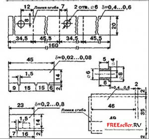 Печатная плата помещена в прямоугольный герметичный корпус, разделённый на 4 части экранирующими перегородками (рис. 2, 4). Чертежи деталей корпуса приведены на рис. 3. Он состоит и боковой стенки 1, втулки 2, перегородки 3, 4 и крышек 5. Детали 1, 3, 4 и 5 изготовляют из листовой латуни (удобно использовать отожженную над газовой горелкой пластину фотоглянцевателя), детали 2 вытачиваются из латунного прутка. Втулки 2 рассчитаны на то, что вход и выход усилителя выполнены 75-омным коаксиальным кабелем с наружным диаметром по изоляции 4 мм. Можно использовать другой 75-омный кабель, но в этом случае необходимо соответственно изменить диаметры втулок 2 и отверстий в стенке корпуса 1.