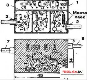Выводы транзисторов должны иметь минимальную длину, особенно вывод эмиттера, который не должен превышать 4 мм. Выводы конденсаторов С4, С5, С7 и С10 должны быть не более 4 мм, а конденсаторы С1, С2, С6 и С9 - составлять 4-6 мм (они являются дополнительными индуктивностями, включёнными в контура). Одни из выводов конденсаторов С1 и С2 впаяны в плату, а другие - припаяны непосредственно к центральной жиле входного коаксиального кабеля. Конденсаторы С6 и С9 одним концом припаяны к очищенным от краски головкам резисторов R2 и R6. Другой конец С6 в плату, а С9 - припаян к центральной жиле выходного коаксиального кабеля. Конденсатор С2 одним концом впаян в плату, а другим концом припаян к катушке L1 на расстоянии 3/4 витка от верхнего по схеме конца. Резисторы R3, R4, R7 и R8 установлены вертикально.