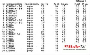 В усилителе могут быть использованы СВЧ малошумящие транзисторы с граничной частотой fгр. более 2 ГГц. Если усилитель будет работать в диапазоне 21-60 каналов, то можно применять транзисторы с fгр. более ГГц, а если - только в диапазоне 21-40 каналов, то - с fгр. более 800 МГц. при этом необходимо в первый каскад ставить транзистор с меньшим коэффициентом шума, а во второй - с большим коэффициентом усиления. В табл. 1 приведены параметры транзисторов, которые можно использовать в усилителе. Транзисторы расположены в порядке ухудшения параметров.