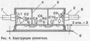 Собирают усилитель в следующей последовательности. Монтируют на плате все элементы кроме резисторов R1 и R5. Если используются транзисторы не с планарными выводам, то для них сверлят в плате отверстия, а в перегородках 4 делаются прямоугольные вырезы (на рис. 3 показаны штриховой линией). В плату впаиваются соответствующими выступами перегородки 3 и 4. Сгибают и спаивают боковую стенку корпуса 1. В неё герметично впаивают втулку 2. Входной 7 и выходной 8 коаксиальные кабели длиной по 80 см вставляют в отверстия втулок, оплетку разделяют на 2 части и припаивают к корпусу изнутри. Центральная жила кабелей должна выступать внутрь корпуса на 3-4 мм. Вставляют плату в корпус, так чтобы кромки перегородок 3, 4 и кромка стенки 1 лежали в одной плоскости (рис. 4), и пропаивают стыки перегородок между собой и корпусом. Кроме того в 10-ти точках припаивают нечетную плату к стенке 1. Места пайки показаны на рис. 2 и рис. 4. Припаиваются к центральным жилам кабелей элементы С1, L1 и С9, L6. Внимательно сверяют рис. 1, 2 и 4 правильности монтажа.