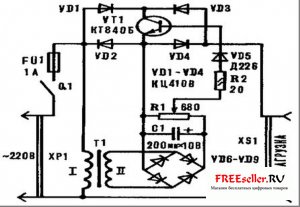 Теперь несколько рекомендаций тем, кто захочет усовершенствовать устройство. Изменения в основном касаются увеличения выходной мощности регулятора. Так, например, при использовании транзистора КТ856 мощность, потребляемая нагрузкой от сети, может составлять 150 Вт, для КТ834 - 200 Вт, а для КТ847-250 Вт. Если необходимо еще больше увеличить выходную мощность прибора, в качестве регулирующего элемента можно применить несколько параллельно включенных транзисторов, соединив их соответствующие выводы. Вероятно, в этом случае регулятор придется снабдить небольшим вентилятором для более интенсивного воздушного охлаждения полупроводниковых приборов. Кроме того, диодный блок VD1-VD4 потребуется заменить на четыре более мощных диода, рассчитанных на рабочее напряжение не менее 250 В и величину тока в соответствии с потребляемой нагрузкой. Для этой цели подойдут приборы серий Д231-Д234, Д242, Д243, Д245- Д248. Необходимо будет также заменить VD5 на более мощный диод, рассчитанный на ток до 1 А. Также больший ток должен выдерживать предохранитель.