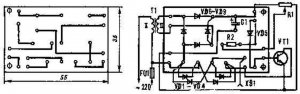 Значение тока нагрузки зависит от величины управляющего напряжения на базе VT1. Вращая движок R1 и изменяя значение управляющего напряжения, управляют величиной тока коллектора VT1. Этот ток, а следовательно, и ток, протекающий в нагрузке, будет тем больше, чем выше уровень управляющего напряжения, и наоборот. При крайнем правом по схеме положении движка переменного резистора транзистор окажется полностью открыт и "доза" электроэнергии, потребляемая нагрузкой, будет соответствовать номинальной величине. Если движок R1 переместить в крайнее левое положение, VT1 окажется запертым и ток через нагрузку не потечет. Управляя транзистором, мы фактически регулируем амплитуду переменного напряжения и тока, действующих в нагрузке. Транзистор при этом работает в непрерывном режиме, благодаря чему такой регулятор лишен недостатков, свойственных тиристорным устройствам. Теперь перейдем к конструкции прибора. Диодные блоки, конденсатор, резистор R2 и диод VD6 устанавливаются на монтажной плате размером 55х35 мм, выполненной из фольгированного гетинакса или текстолита толщиной 1-2 мм (рис.2).