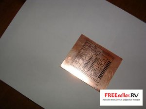 Дальше почти как всегда. Вырезаем (кому как удобней и чем удобней) кусок текстолита нужных размеров с запасом 1 см. с каждого края. На этих местах можно просверлить потом отверстия для совмещения двух слоев (если вы делаете двухстороннюю плату) Очищаем плату от загрязнений. Я не тру "шкуркой нулевкой", а использую Силит-Бэнкс (см. рекламу по телику). Наливаем немного Силита на поверхность платы и ждем. Если поверхность не очень грязная и не сильно окислилась, то хватает 1 мин. Плата на глазах становиться чистенькой и розовой. Если она у вас очень грязная, то ждем подольше или повторяем процедуру несколько раз. Промываем плату водой и несем сушить, За поверхность плату, куда будем переводить рисунок пальцами не брать, но если взялись, то страшного ничего нет, просто перед переносом протрите тампоном, смоченным в ацетоне