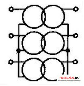 Детали и регулировка схемы. Формирователь прямоугольных импульсов можно выполнить по любой из известных схем. Вместо диодов VD1...VD4 можно применить мост КЦ405. Симисторы VS1...VS3 заменяются тиристорами КУ202, т.к. на их входы подается постоянное напряжение. Постоянная времени т RC-цепей R2, С3 и R3, С4 рассчитана по формуле T=1,4RC. Приняв емкость конденсаторов СЗ, С4 равной 0,01 мкФ, находим сопротивление резисторов R2, R3, которое составляет 476,186 к. При этом постоянная времени т составляет 6,666604 мс, что практически равно сдвигу на 1/3 периода. Для более точной подгонки т RC-цепей резисторы R2, R3 состоят из последовательно соединенных постоянного и подстроечного резисторов общим номиналом около 510 к. Подстроечным резистором подгоняют т RC-цепей, контролируя сдвиг фаз на выходах трансформаторов Т2...Т4 фазометром, так чтобы сдвиг фаз оказался как можно ближе к 120°.