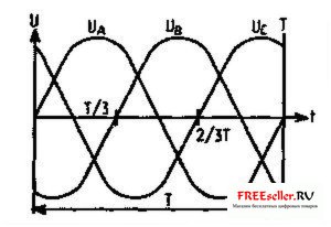 - лишние "навороты" для автоматизации отключения пускового конденсатора и при замене бумажных конденсаторов электролитическими. Предлагаю еще один вариант подключения трехфазных потребителей к однофазной сети. Если посмотреть па график трехфазного напряжения, видно, что каждая кривая сдвинута относительно другой на 1/3 периода (рис.1). Частота сети равна 50 Гц, следовательно, период Т равен 20 мс. Отсюда следует, что 1/3 периода составляет 6,666... мс. Пусть Ua на рис.1 - однофазное синусоидальное напряжение 220 В, 50 Гц. Пропустив Ua через схему задержки на 6,666... мс, получим сдвинутое на 1/3 периода напряжение Uв, по амплитуде и частоте равное Ua. "Пропустив" через аналогичную схему задержки напряжение Uв, получим сдвинутое на 1/3 периода относительно напряжения Uв напряжение Uс.