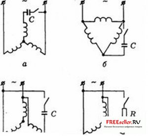 Включение трехфазного двигателя в однофазную сеть. Во многих случаях трёхфазные асинхронные двигатели можно включать в однофазную сеть переменного тока. На рисунках показаны схемы включения трёхфазных двигателей, у которых выведены лишь по три конца обмоток. Конденсатор С создаёт дополнительный сдвиг по фазе между током и напряжением, обеспечивая начальный пусковой момент.