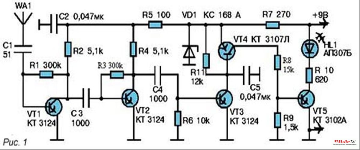 Вариант схемы такого устройства показан на рисунке 1. Разыскиваемый радиосигнал воспринимается антенной WA1 и поступает на широкополосный, без обычного колебательного контура усилитель радиочастоты, собранный на транзисторах VT1, VT2. Усиленный сигнал детектируется каскадом на транзисторе VT3, а выделенная постоянная составляющая усиливается каскадами с транзисторами VT4, VT5. Последний нагружен светоизлучающим диодом HL1 и токоограничивающим резистором R10. В исходном состоянии, пока радиосигналов нет, транзисторы VT3...VT5 заперты. При появлении сигнала транзистор VT3 приоткрывается полуволнами положительной полярности напряжения на резисторе R6; соответственно, приоткрываются транзисторы VT4, VT5, и через светодиод HL1 протекает ток, вызывающий его свечение. Оно тем ярче, чем ближе антенна прибора к скрытому источнику сигнала.
