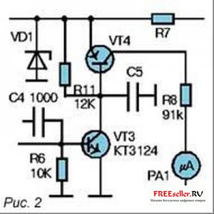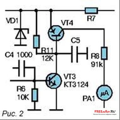 Однако у светодиода в качестве индикатора весьма велика зона нечувствительности - ток через него может идти, а свечение еще отсутствовать. Более наглядную картину радиополя даст стрелочный прибор; его включают, как показано на фрагменте соответственно измененной части схемы (рис. 2). Прибором РА1 может служить микроамперметр, применяемый в аудиомагнитофонах для контроля уровня записи. Малые габариты искателя "радиожучков" позволяют, положив его в карман, выяснить в незнакомой вам обстановке, нет ли угрозы конфиденциальности вашего общения.