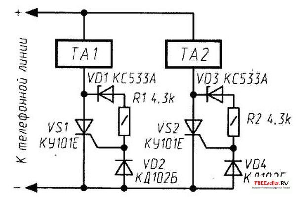Трубка, снятая с аппарата ТА1, открывает стабилитрон VD1 и соответственно тиристор VS1, подключая тем самым к сети именно этот телефонный аппарат. Это подключение снижает напряжение в линии с 60 В до 8…15 В и блокирует тем самым работу аппарата ТА2, поскольку такое напряжение будет уже недостаточным для пробоя стабилитрона VD3 и, соответственно, включения тиристора VS2.