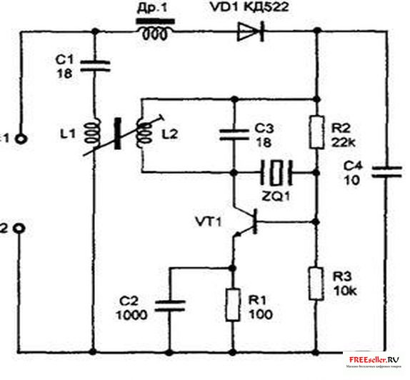 Дроссель Др1 служит для разделения высокочастотного и низкочастотного сигналов. Диод VD1 предохраняет устройство от выхода из строя в случае неправильного подключения. Схема подключения устройства представлена на рис. 2.