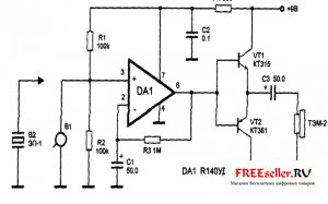Передатчик подключается параллельно телефонной трубке. Когда трубка положена на рычаг, разговорный узел отключен от линии. Подключена к линии в этот момент только цепь вызывного устройства. Таким образом, до тех пор пока трубка не снята, напряжение питания на передатчик не поступает. Как только трубку снимают, к линии подключается разговорная часть. Во время разговора ток через разговорную часть меняется синхронно с речью, соответственно изменяется и напряжение в точках +Л1 и -Л1.