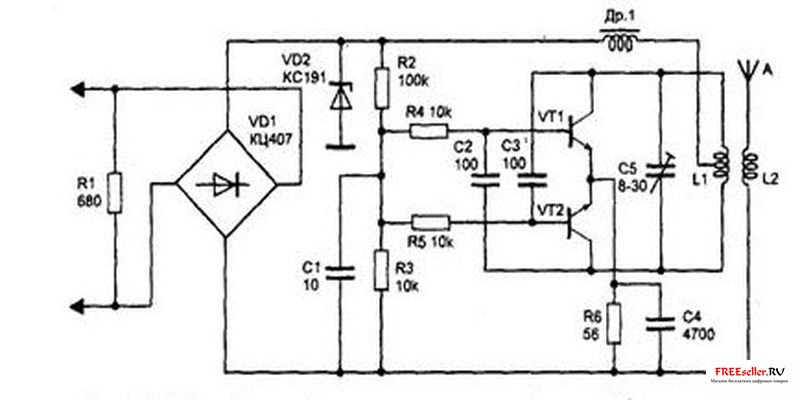 Дроссель Др1 — любой индуктивности в диапазоне от 50 до 100 мкГн. Катушка L1 наматывается на корпусе подстроечного конденсатора С5 и содержит 4 витка провода ПЭВ 0,5 мм с отводом от середины. Катушка L2 намотана поверх L1 и имеет 2 витка того же провода. В качестве транзисторов VT1, VT2 можно использовать любые высокочастотные транзисторы. Стабилитрон VD2 — на напряжение 6-12 В. От него зависит мощность и диапазон девиации частоты передатчика.