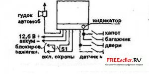 При охране автомобиля устройство работает с двумя типами внешних датчиков: а - для дверей (датчик дверей или датчик механических колебаний) - включает звуковой сигнал с задержкой 6 сек., б - для закрытого капота и багажника -включают звуковой сигнал мгновенно. Владелец автосторожа при срабатывании сигнализации по звуку может легко определить группу датчиков, сработавших во время охраны Электросхема автосторожа обеспечивает после включения охраны задержку 12+2 сек. для выхода из автомобиля и 6+1 сек. для входа в автомобиль для отключения сигнализации до срабатывания звукового сигнала.