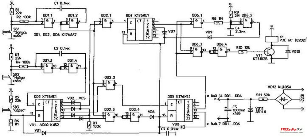 На счетчике DD3 реализовано кодирующее устройство - код устанавливается соответствующей коммутацией выходов счетчика DD3; не задействованные в коде выходы через диоды VD2...VD5 с помощью элементов DD2.3, DD2.4, VD6 формируют сигнал "сброс", поступающий на входы R счетчиков DD4, DD5 в случае неправильного набора кода. Элементы DD2.1, DD2.2 предназначены для записи кода в счетчики OD4, DD5. Диоды VD7, VD8 формируют сигнал "Сброс" на входах R счетчиков DD4, DD5 в случае неправильной записи кода. Элементы DD6.1. R8, R9, С4, DD6.2, VD9 формируют задержанный на 4 с сигнал "сброс". Задержка необходима для срабатывания исполнительного устройства. Элементы DD6.3, DD6.4 открывают транзистор VT1 при правильно набранном и занесенном коде. Контакты реле К1 коммутируют исполнительное устройство. Источник питания, состоящий из VD12, R11, VD11, С5 (без сетевого трансформатора с гасящим резистором), построен по традиционной схеме.